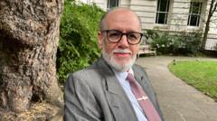 BBC George Psaradakis in a mauve tie, grey suit and black glasses sits on a bench in a park with a tree trunk behind him.BBC