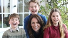 The photo shows the princess sitting down, surrounded by Princess Charlotte, Prince Louis and Prince George, wrapping his arms around her.